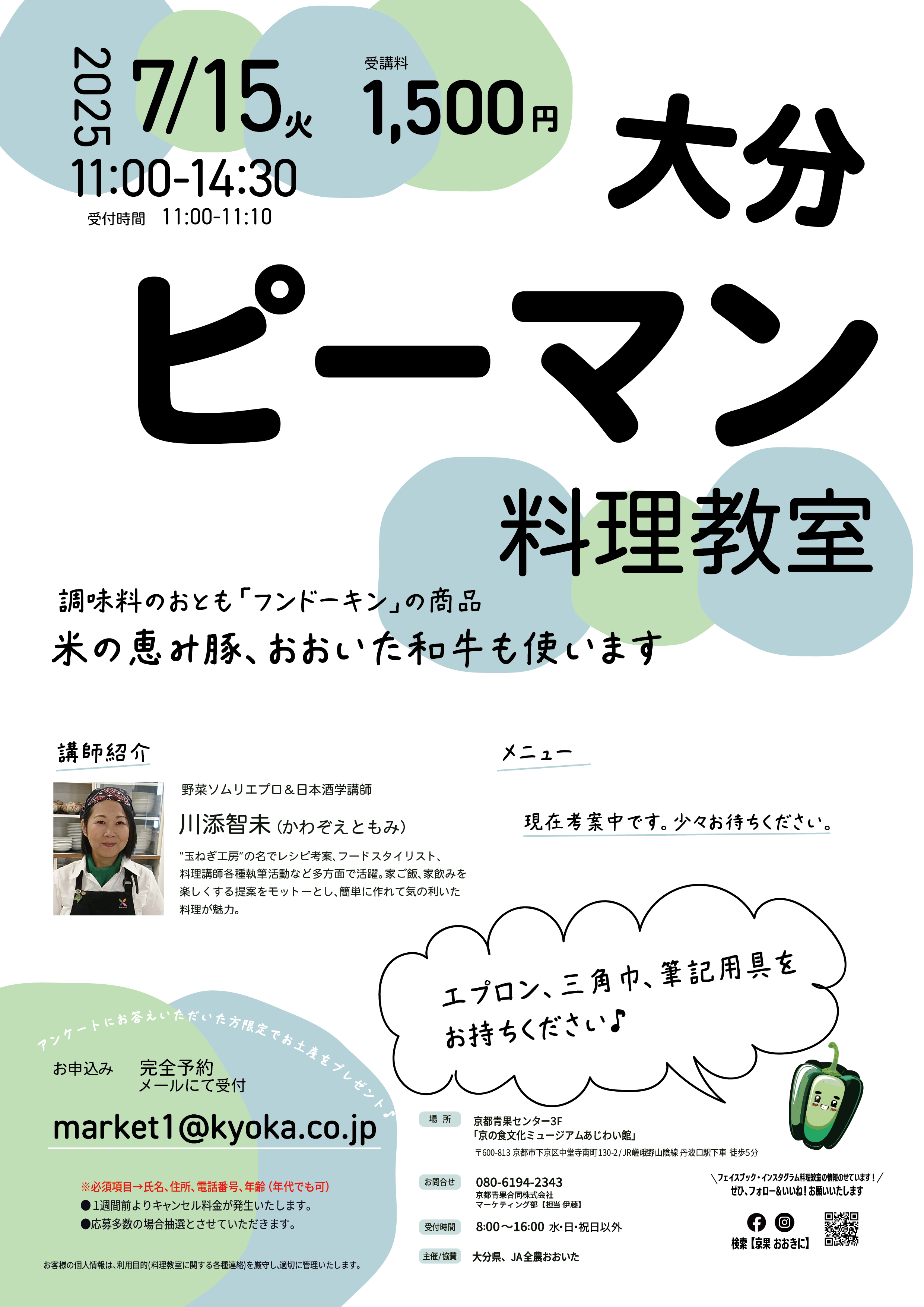 (頂いた個人情報については、本料理教室に各種連絡の目的にのみ使用致します。予めご了承ください。)